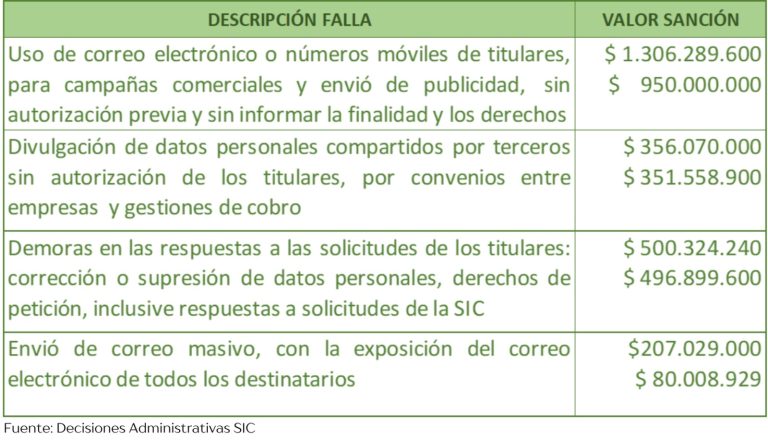 En cuanto a violación de protección de datos personales, las fallas humanas más frecuentes y que han ocasionado las multas más costosas, impuestas por las Superintendencia de Industria y Comercio SIC, autoridad de protección de datos personales en Colombia, son (SIC Sede Electrónica, s.f.):
